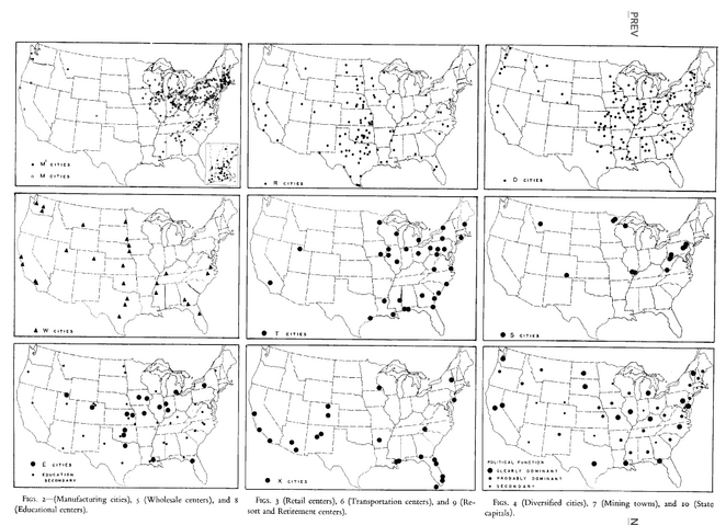 自上而下分別為,美國⑴制造業(yè)城市⑵批發(fā)中心城市⑶教育中心城市⑷零售中心城市⑸交通樞紐城市(鐵路和港口)⑹退休和度假勝地⑺“多功能”城市(貿(mào)易與制造業(yè)同等發(fā)展,但皆非占據(jù)主要地位)⑻礦產(chǎn)城市⑼州首府的分布情況。