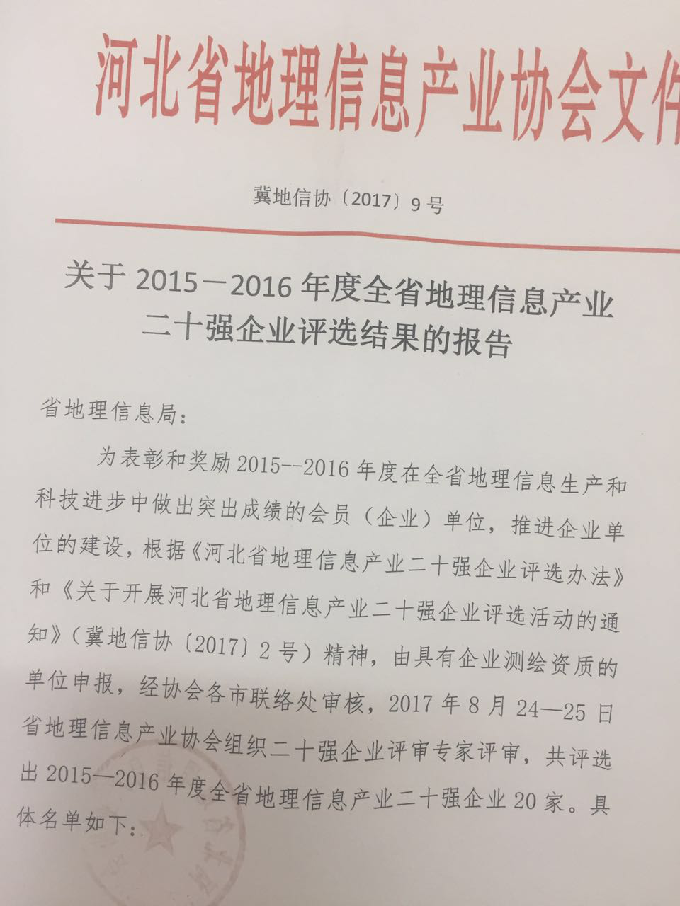 參觀時我去聽取了宣處長講話,局里領導對我單位高度認可,今年我單位參加了《2015-2016年度全省地理信息產業二十強企業評選》,很榮幸評上2015-2016年度全省地理信息產業二十強企業,對于以后的測繪工作,我們單位也會再接再厲,努力創出更多佳績。