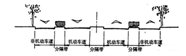 以三條分隔帶使對向車流分行、機動車與非機動車車種分流的橫斷面形式。