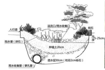 第三是“滯”,主要作用是延緩短時間內形成的雨水徑流量。比如說,通過微地形調節(jié),讓雨水慢慢地匯集到一個地方,用時間換空間。我們城市內的降雨,是按分鐘計、按小時計的,這跟大江大河不一樣。城市內短歷時強降雨,對下墊面產生沖擊,形成快速徑流,積水攢起來就導致內澇。因此,“滯”非常重要,可以延緩形成徑流的高峰。