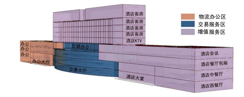 區別于傳統鐵路貨場散點式的的生產配套房屋布局規劃,嘉寶物流園區在西南角集中建設了一幢九層高,總建筑面積約4.2萬平米的嘉寶物流大廈,作為園區的標志性建筑物及綜合性服務大樓,其功能不緊緊涵蓋了服務物流園的基本生產管理功能,同時也承擔了為嘉寶物流園區提供各項增值服務的經濟開發功能(圖9)。其主要功能包括:網上交易、流通加工、貨運代理、貿易、金融、工商、咨詢、會議餐飲、酒店住宿等各種綜合服務性功能(圖10)。集約式的規劃布局既可以充分提高園區土地利用率及生產組織管理效率,還可以提升園區室內外環境品質,統領園區的整體形象。