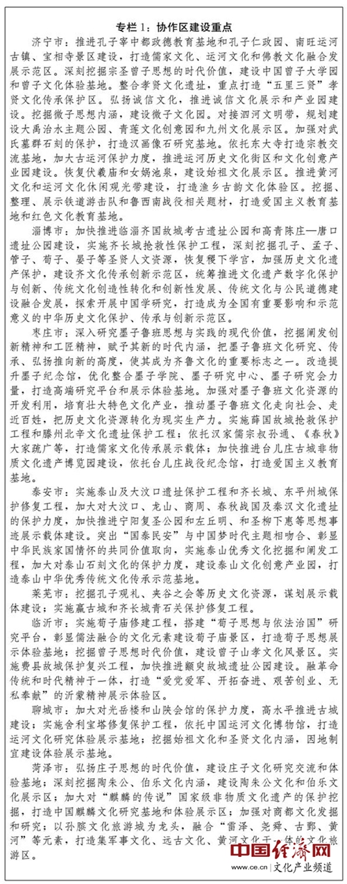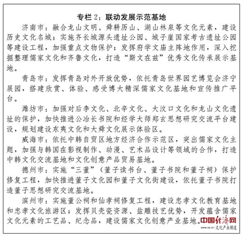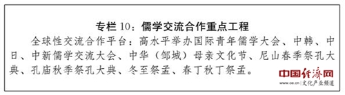 (四)建設(shè)全國(guó)文化經(jīng)濟(jì)融合發(fā)展示范區(qū)。充分發(fā)揮文化引領(lǐng)、滲透和支撐作用,系統(tǒng)推進(jìn)文化資源開(kāi)發(fā),強(qiáng)化文化品牌載體功能,推進(jìn)文化與相關(guān)產(chǎn)業(yè)深度融合,大力發(fā)展文化產(chǎn)業(yè),提升文化產(chǎn)業(yè)園區(qū)、特色基地建設(shè)水平,在更高層次上打造享譽(yù)國(guó)內(nèi)外、彰顯儒家文化永恒魅力的旅游休閑圣地、教育培訓(xùn)基地、健康養(yǎng)生福地和文化創(chuàng)意高地。