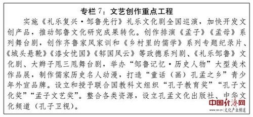 (四)打造儒藝創(chuàng)意文化產(chǎn)業(yè)基地。以曲阜新區(qū)國(guó)家級(jí)文化產(chǎn)業(yè)示范區(qū)和孟子湖新區(qū)為重點(diǎn),突出創(chuàng)意文化環(huán)節(jié)的開(kāi)發(fā)和拓展,推動(dòng)創(chuàng)意文化產(chǎn)業(yè)與其他產(chǎn)業(yè)的相互滲透和融合發(fā)展,建設(shè)具有儒家特色的創(chuàng)意文化產(chǎn)業(yè)集群。依托文化文物單位館藏文化資源,充分采用數(shù)字化、信息化技術(shù),研發(fā)推出工藝精良、制作精美的文物創(chuàng)意產(chǎn)品、旅游紀(jì)念品和衍生創(chuàng)意產(chǎn)品,促進(jìn)文化創(chuàng)意產(chǎn)品創(chuàng)新發(fā)展。大力發(fā)展以儒家文化品牌為主導(dǎo)的動(dòng)漫產(chǎn)業(yè),積極加強(qiáng)基于虛擬現(xiàn)實(shí)技術(shù)的原創(chuàng)動(dòng)漫游戲產(chǎn)品創(chuàng)作,構(gòu)建高端動(dòng)漫、網(wǎng)絡(luò)游戲產(chǎn)業(yè)發(fā)展體系。積極推動(dòng)與儒家文化品牌動(dòng)漫有關(guān)的圖書(shū)、報(bào)刊、音像制品的發(fā)行出版,引導(dǎo)企業(yè)開(kāi)發(fā)生產(chǎn)衍生產(chǎn)品。積極采用全景環(huán)繞、虛擬現(xiàn)實(shí)等技術(shù),創(chuàng)作一批影視精品、舞臺(tái)劇、音樂(lè)劇,打造高品質(zhì)旅游實(shí)景演藝產(chǎn)品,再現(xiàn)孔孟形象,反映儒學(xué)思想對(duì)人類(lèi)文明的貢獻(xiàn)、春秋戰(zhàn)國(guó)時(shí)代的社會(huì)變革;積極加強(qiáng)與中央和省市各級(jí)電視臺(tái)、影視制作單位和網(wǎng)絡(luò)媒體的戰(zhàn)略合作,爭(zhēng)取建設(shè)影視基地。