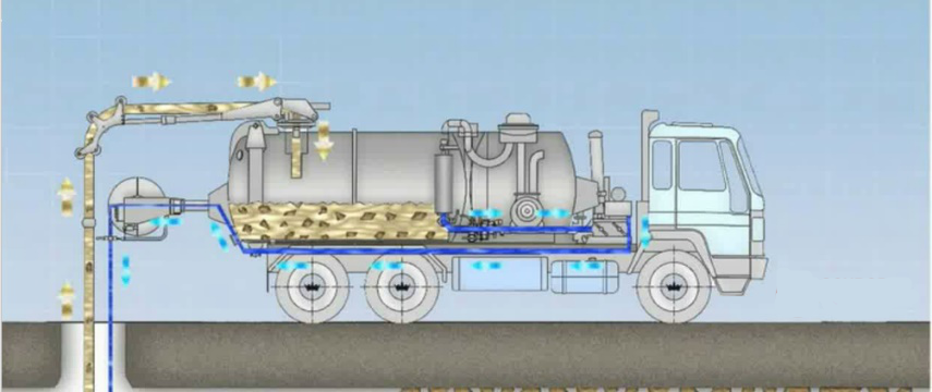 高壓水車把分段的兩檢查井向井室內灌水,使用疏通器攪拌檢查井和污水管道內的污泥,使淤泥稀釋;人工要配合機械不斷地攪動淤泥直至淤泥稀釋到水中。