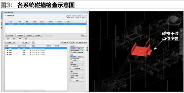 5.參照后的項目文件參照完成后可在項目中進行各系統(tǒng)模型的碰撞檢查(如圖3),預先檢查出各干涉點位,把問題解決在設計的初級階段,減少后期的返工和整改,從而保證項目設計質(zhì)量,減少整個項目的運營成本。