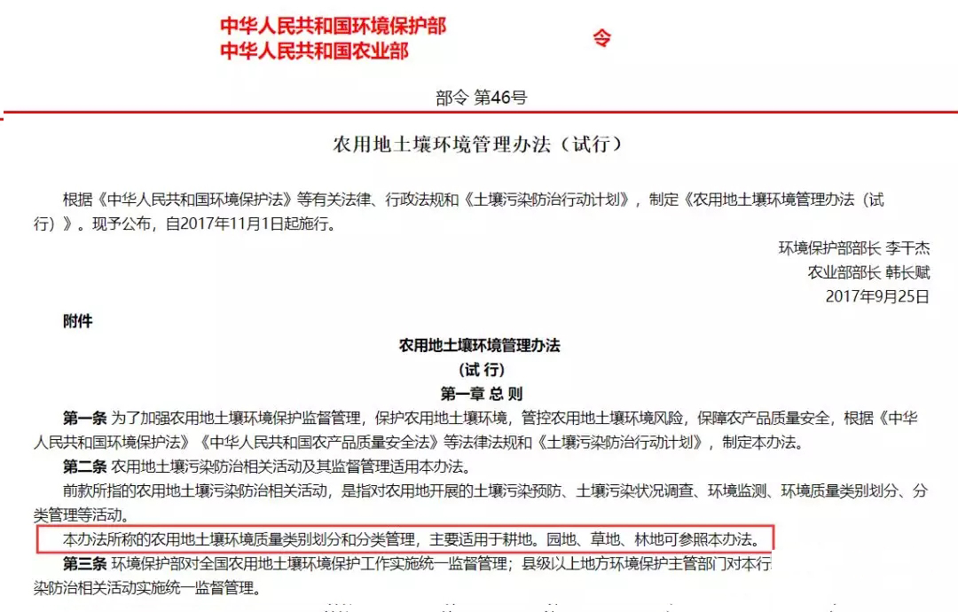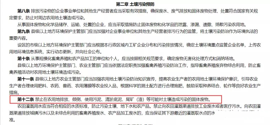 在該標準發(fā)布之前,環(huán)保部和農(nóng)業(yè)部于2017年9月25日聯(lián)合發(fā)布了《農(nóng)用地土壤環(huán)境管理辦法(試行)》(環(huán)境保護部、農(nóng)業(yè)部令 第46號),自2017年11月1日起施行。該辦法第二條第三款規(guī)定:“本辦法所稱的農(nóng)用地土壤環(huán)境質(zhì)量類別劃分和分類管理,主要適用于耕地。園地、草地、林地可參照本辦法。”同時,該辦法第十二條第一款規(guī)定:“禁止在農(nóng)用地排放、傾倒、使用污泥、清淤底泥、尾礦(渣)等可能對土壤造成污染的固體廢物。"看到這里小伙伴們是不是有點蒙了,一個是強制性國家標準,一個是部門規(guī)章,一個說只要滿足要求就可以用,另一個卻說禁止用。