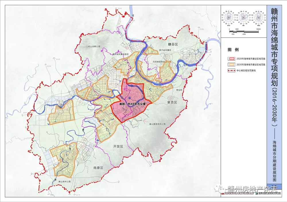 參照海綿城市近期建設要求“近期到2020年,城市建成區20%以上的面積達到將75%的降雨就地消納和利用的海綿城市要求。”2020年,贛州市城市建成區為200平方公里,2020年20%面積(即40平方公里)達到75%的降雨就地消納和利用的海綿城市要求,結合上述近期建設重點區域確定原則,確定近期建設重點區域。