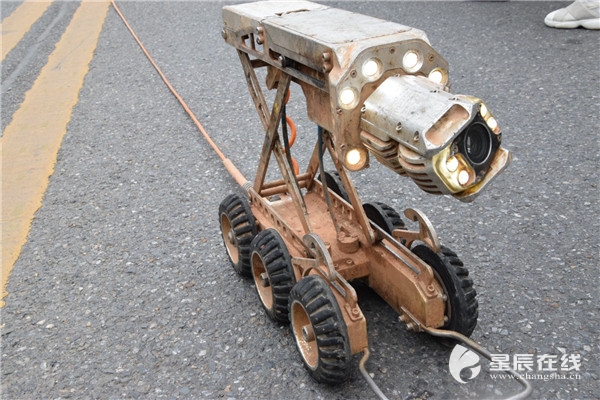 (在長沙縣西霞路中間一處下水井旁,準備使用“管道機器人。”)