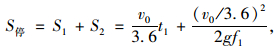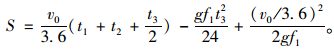 式中,v0為汽車運(yùn)行速度;f1為縱向摩阻系數(shù),依車速及路面狀況而定;g為重力加速度(9.8 m/s2);t1為駕駛者反應(yīng)時(shí)間,取2.5 s(判斷時(shí)間1.5 s,運(yùn)行時(shí)間1.0 s)。