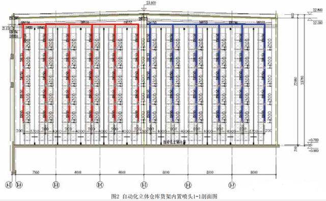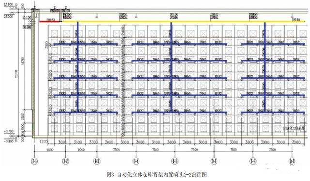 1、自動化立體倉庫由于最大儲物高度超過13.5m,頂板下噴頭無法滿足滅火要求,需要頂板下噴頭和貨架內(nèi)噴頭結(jié)合布置,達到滅火作用,頂板下噴頭采用的噴頭特性系數(shù)需要通過計算確定,需滿足噴頭噴水強度要求。