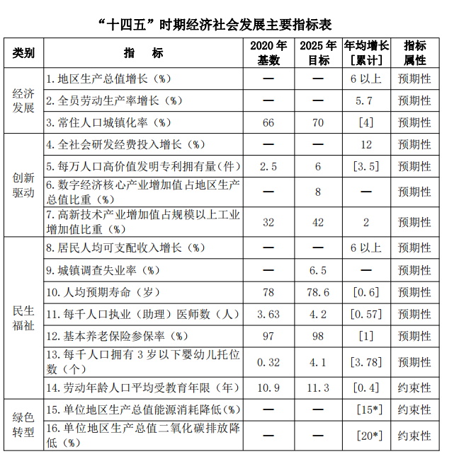 ——經濟質量效益顯著提升。京津冀協同創新共同體建設 縱深推進,高質量發展體系更加完善,科技進步貢獻率明顯上 升,產業基礎高級化、產業鏈現代化水平大幅提升,農業基礎 更加穩固,實體經濟、先進制造業、數字經濟加快發展,現代 服務業高質量提升。綜合經濟實力和政府財力再上新臺階,全市生產總值、一般公共預算收入年均增長分別達到 6%以上、 10.6%,總量分別達到 8000 億元、1000 億元,省會首位度進一 步彰顯,區域中心城市輻射帶動能力和城鄉區域發展協調性明 顯增強。