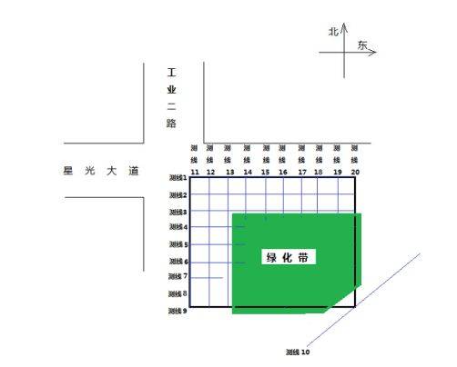 以工業二路與星光大道路口處左幅41#墩位為例,按業主要求及場地實際情況,本次勘察共布置測線20條,對被測區域進行網格劃分,測區內管線測線布置如下圖所示。(其它各墩位測線以此類推)