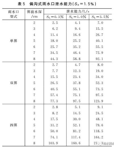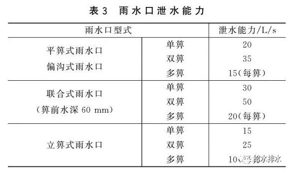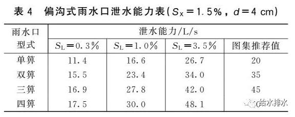 國家標(biāo)準(zhǔn)圖集《雨水口》(16S518)提供了一個(gè)在一定水力條件下(道路縱坡0.3%~3.5%,橫坡1.5%,箅前水深40 mm)通過1∶1的水工模型經(jīng)過試驗(yàn)確定的不同型式雨水口泄水能力,如表3所示。