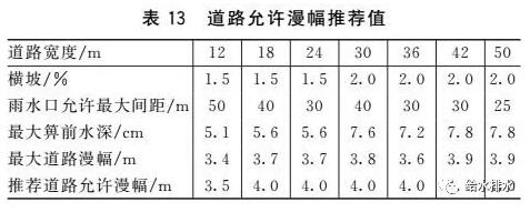 我國尚無明確的道路漫幅規(guī)定,建議有關(guān)部門盡快制定相關(guān)的標(biāo)準(zhǔn)。在相關(guān)標(biāo)準(zhǔn)未出臺前,設(shè)計(jì)人員計(jì)算時(shí)采用的道路漫幅可參考表13推薦值。