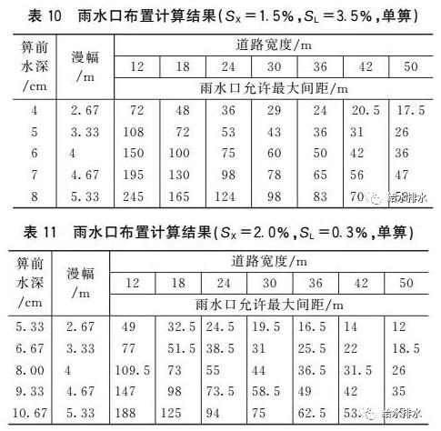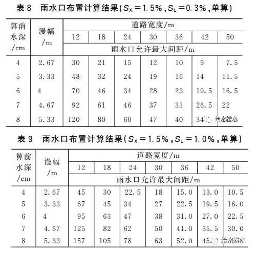 (5)如果以表1中允許漫幅作為雨水口布置的依據(jù),那么《室外排水設(shè)計(jì)規(guī)范》推薦的雨水口允許最大間距(25~50 m)均可以滿足要求。例如,對于縱坡0.3%和橫坡1.5%的50 m寬道路,當(dāng)雙側(cè)間隔28.5 m布置單箅雨水口時(shí),其箅前水深為8 cm,漫幅為5.33 m,此時(shí)立緣石未淹沒(立緣石外露高度為10~20 cm),且未淹沒2條車道(至少6.5 m寬)。