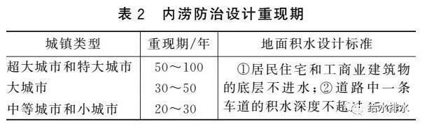 《Urban Storm Drainage Criteria Manual》對于內(nèi)澇防治設(shè)計(jì)重現(xiàn)期時(shí)的道路積水有詳細(xì)規(guī)定,我國《室外排水設(shè)計(jì)規(guī)范》有類似規(guī)定,見表2。