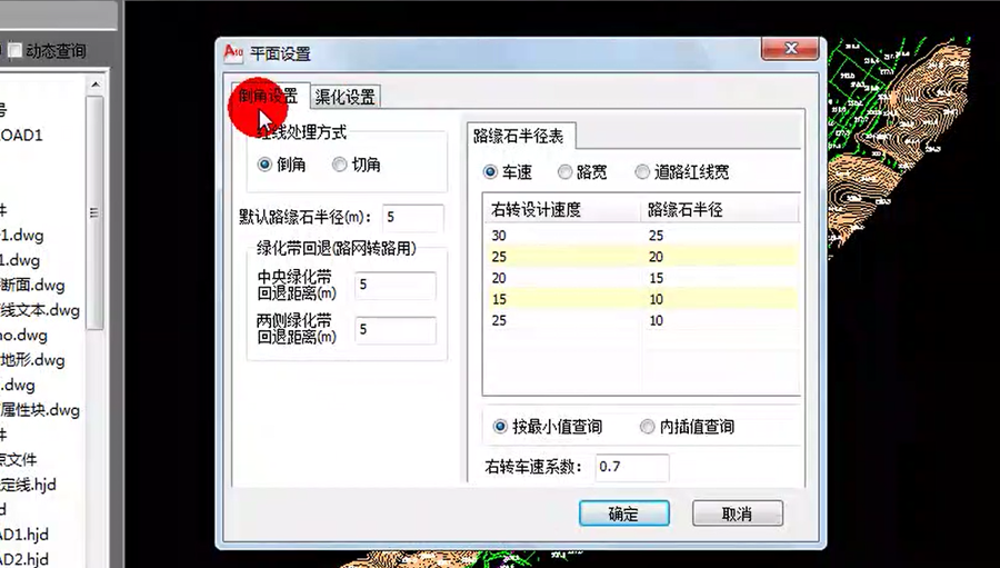 1)路緣石半徑表有車速、路寬、道路紅線寬。車速是針對不同的右轉設計速度對于不同的路緣石半徑,輸入右轉車速系數“0.7”。