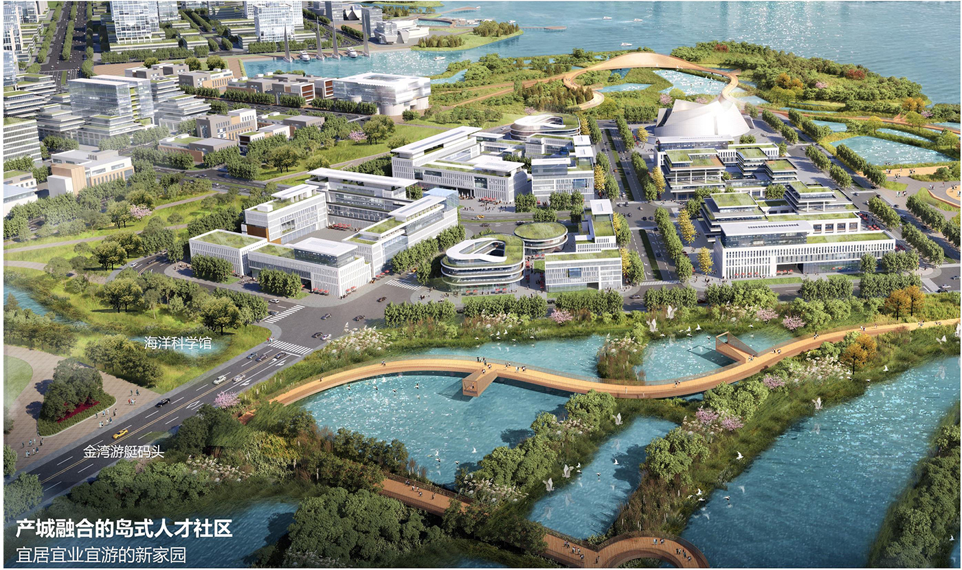 設計要點:重點貫通濱海空間,提升改造原漁港公園、中澳友誼花園,新增軍民公園、體育公園、海軍修船廠公園三大主題公園46公頃,打造一灣兩岸最活力、最繽紛的濱海公共空間。設計三條通海廊使濱海活力向內城滲透,四組團朝濱海扇形展開,形成沿海岸線步移景異的城市形象。