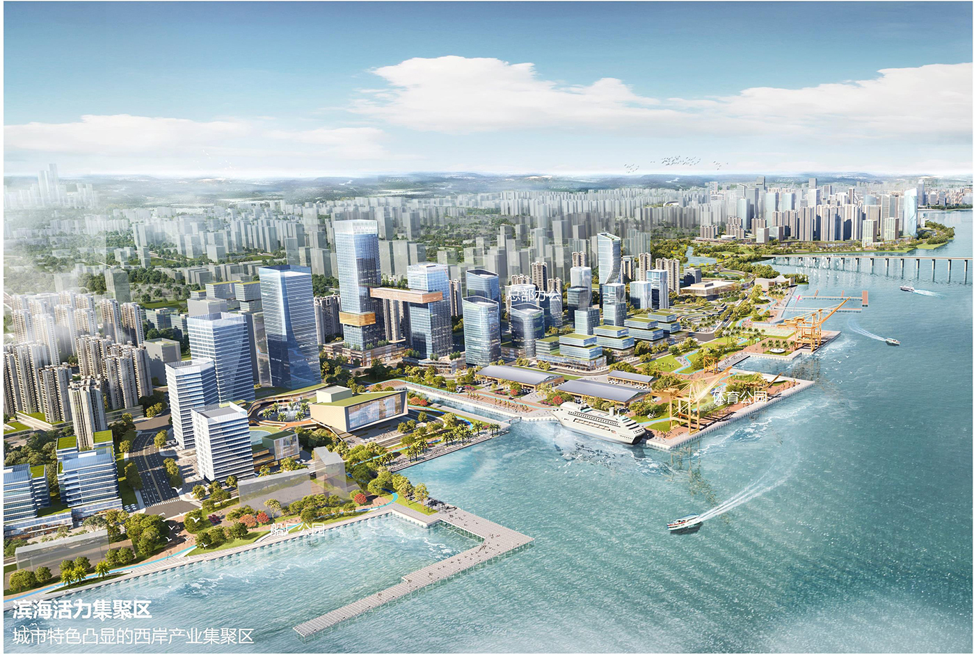 著重從五個層面進行整體提升:①編織生態網絡,保護生態與濱海岸線,實現城海共棲;②通過東西對景、地標點亮的設計策略提升兩岸風貌特色;③完善綠地與公共空間系統,為湛江市民提供海味生活的極致體驗;④綜合交通方面,通過加強軌道支撐,加快建設跨海通道實現兩岸直連;⑤引入產業觸媒項目,擁灣驅動產業發展。