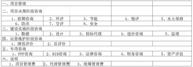 PPP項目主要咨詢服務內容包括:項目建議書、可行性研究報告,初步實施方案、物有所值評價報告、財政承受能力論證報告、實施方案,PPP項目合同咨詢、項目招標采購代理、中期評估、建設期或運營期績效考核細化服務方案,建議參照項目投資規模進行收費,具體如下: