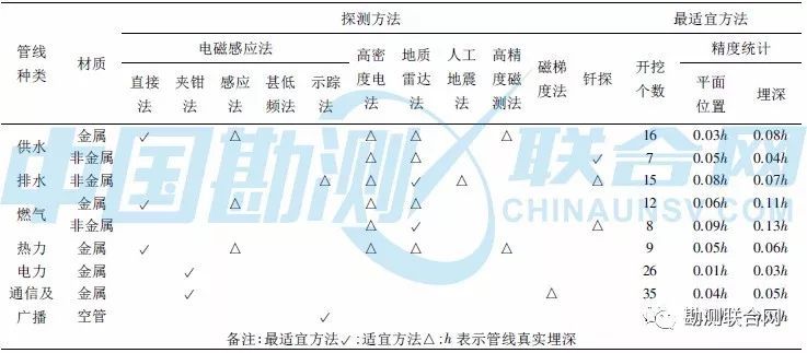 本文精度統(tǒng)計數(shù)據(jù)源于本單位近幾年的管線探測項目,統(tǒng)計分析難免存在一定的片面性,本文推薦的最適宜方法可作為地下管線探測施工方法選擇時的參考。