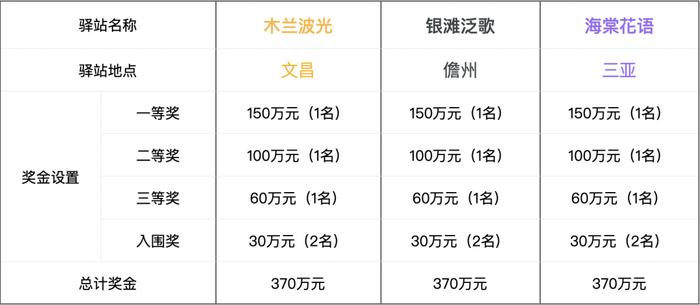 每個驛站分別設置一、二、三等獎及入圍獎,總獎金池達1,110萬元(稅前)。獎金情況公示如下: