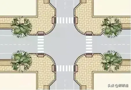 采用較大半徑且渠化拓寬的交叉口,長(zhǎng)這個(gè)樣子: