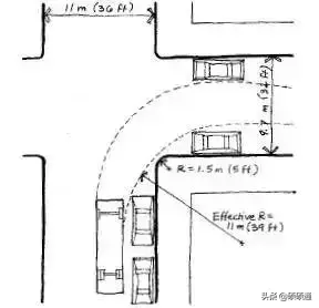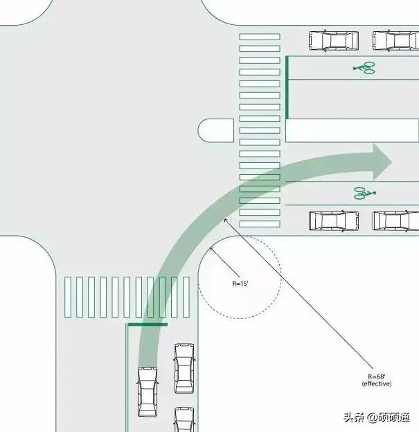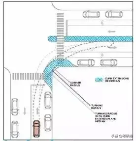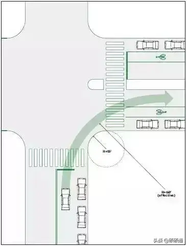 《美國(guó)城市街道設(shè)計(jì)手冊(cè)》規(guī)定,常規(guī)城市道路交叉口轉(zhuǎn)彎半徑是3~4.5米(10~15英尺),且在很多城市,轉(zhuǎn)彎半徑用了非常小的0.6米(2英尺),大于4.5米的轉(zhuǎn)彎半徑只會(huì)在極特殊情況下才會(huì)采用。