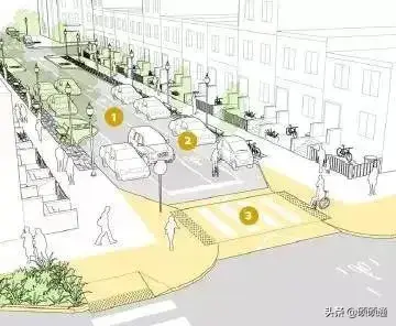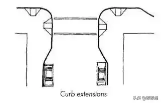 此外,在居住區(qū)或是有路側(cè)停車的城市支路,可將交叉口進(jìn)行縮窄設(shè)計(jì),以減小行人過街距離,進(jìn)一步降低車輛轉(zhuǎn)彎速度、保障行人安全。