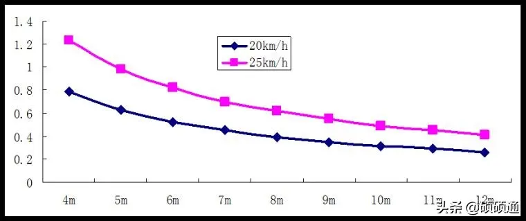 車輛轉(zhuǎn)彎有輪差,所以轉(zhuǎn)彎車道寬度要求一般稍大。以常規(guī)大巴公交車行駛為例,橫向側(cè)距取0.5米,則可以計(jì)算得出車道寬度和轉(zhuǎn)彎半徑的對(duì)應(yīng)關(guān)系圖如下。