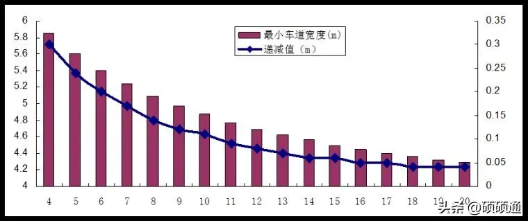 由上圖可以發(fā)現(xiàn),轉(zhuǎn)彎半徑小于9米時(shí),車道寬度大于5米且遞減值迅速增大。從安全角度和用地角度都可以認(rèn)為,小于9米的轉(zhuǎn)彎半徑不夠合理。