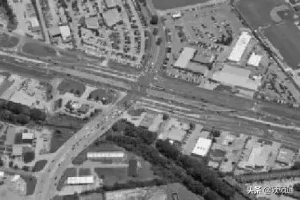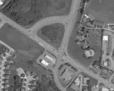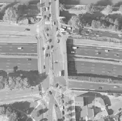 2000 年Jonathan Reid 提出一種新型交叉口設(shè)計(jì)方案,即扇形交叉口(Quadrant Roadway Intersection)。其設(shè)計(jì)思想是主交叉口禁止左轉(zhuǎn),利用十字交叉口某象限內(nèi)的連接通道組織車輛左轉(zhuǎn),簡(jiǎn)化主交叉口信號(hào)相位,從而提高交叉口運(yùn)行效率,改善主交叉口的擁堵狀況。美國(guó)某城市的扇形交叉口實(shí)景圖: