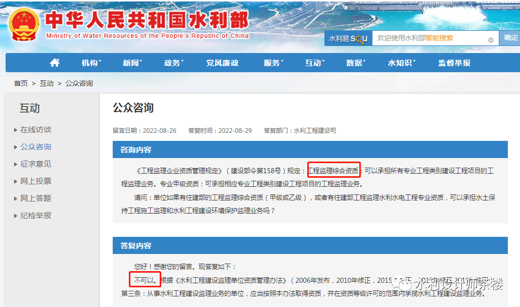 水利部權威回復:住建部頒發的綜合監理、水利監理資質不得從事水利工程監理!