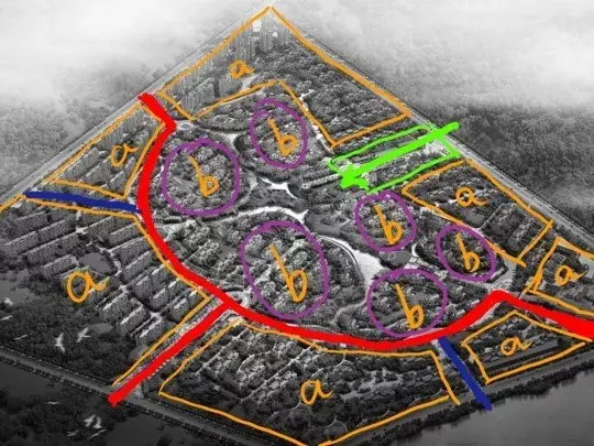 用地中間做環形道路,向外引出錯落的分支道路,形成各自獨立的組團,中心適宜做景觀。