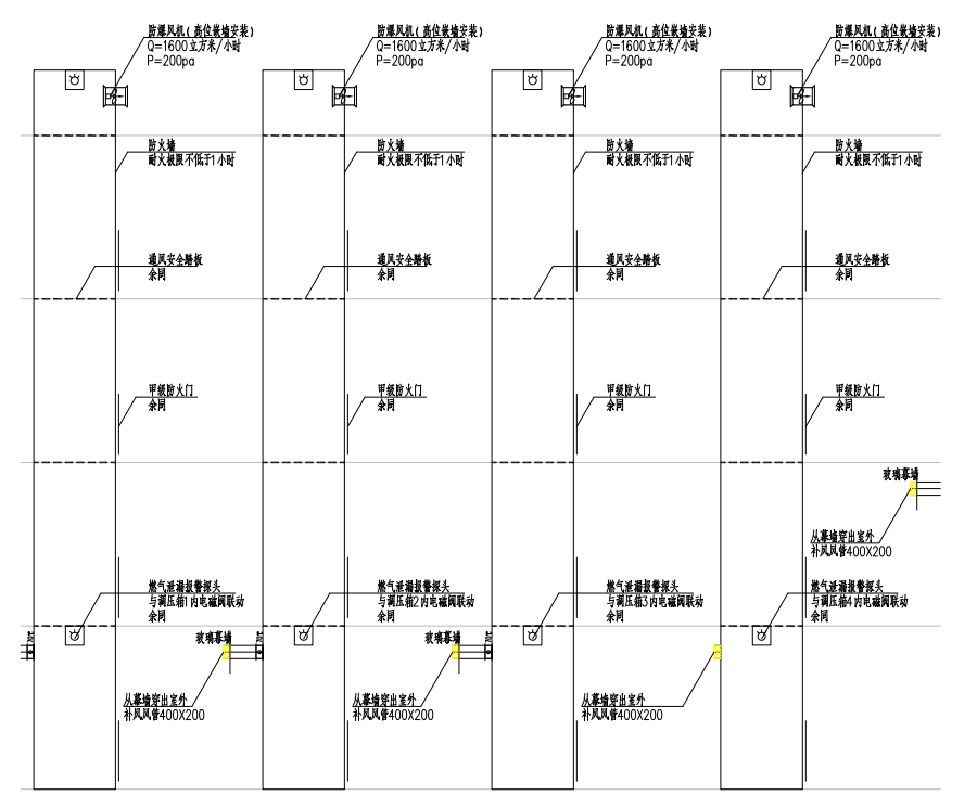 1. 通風不良的管井頂部設防爆風機,底部設補風口(通室外),在管井頂部及底部設燃氣泄漏報警探頭;