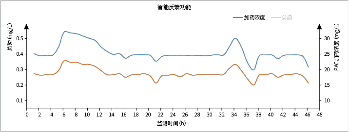 智能反饋功能可根據出水 SS 、 PH 等相關指標的高低來判斷加藥量是否合適,若實際出水監測值和設計值出現較大偏差,程序會自動修正加藥量,達到合理的出水指標。